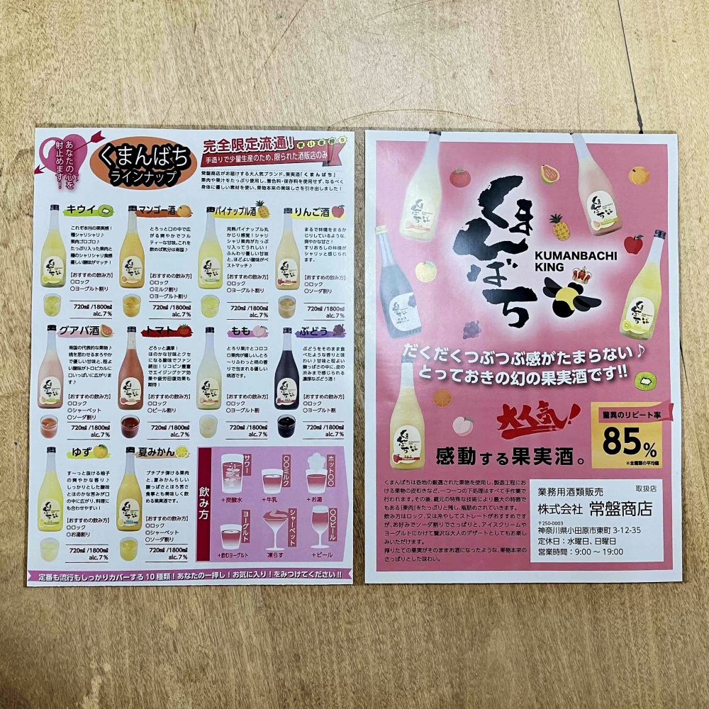 印刷市場では、果実酒くまんばちシリーズのチラシを作成させていただきました。